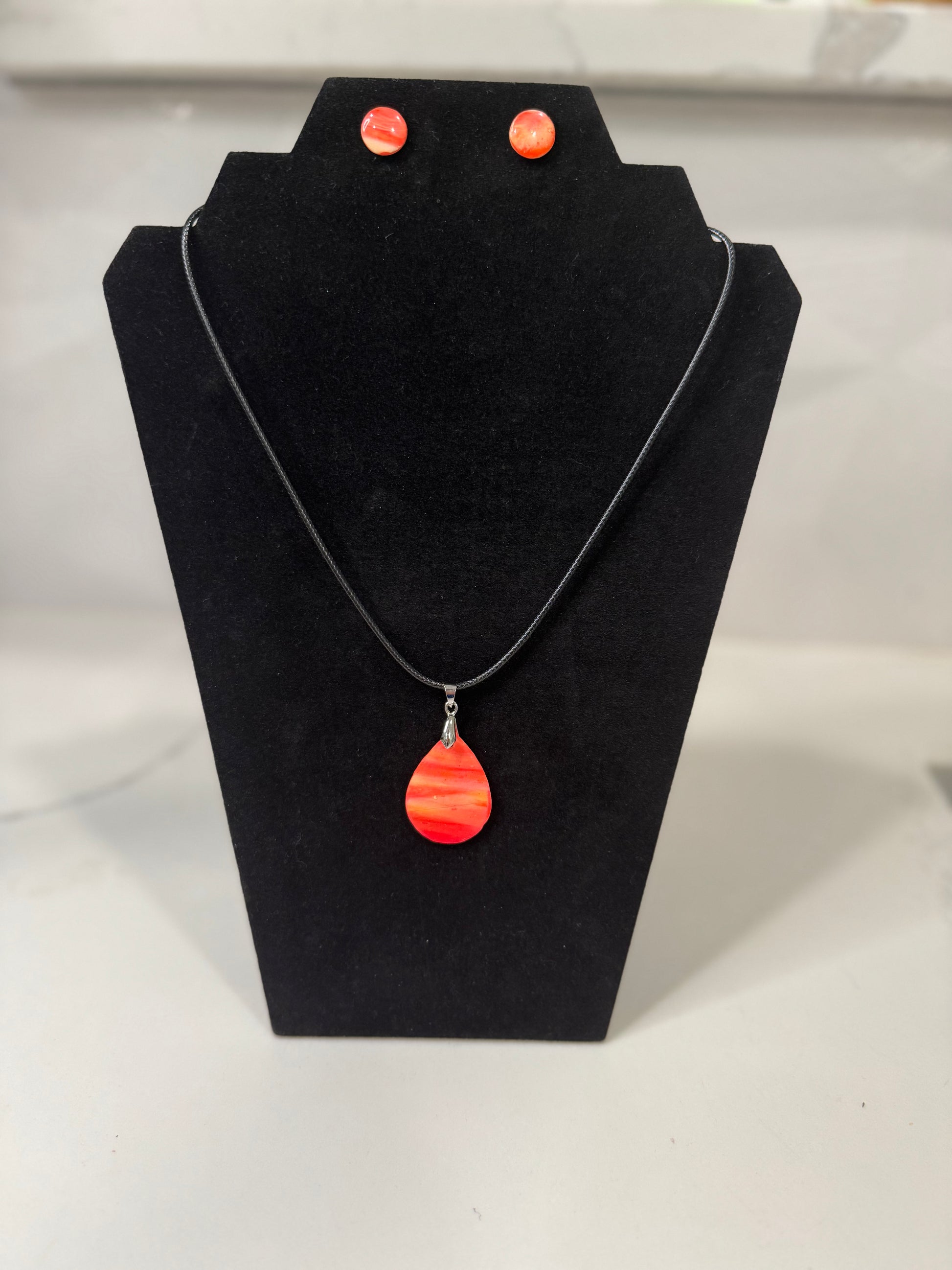 This set reminds me of youth and sunsets. One stud is about 1/3 of an inch and weighs less than one gram. The necklace includes an 18 inch black cord and a small teardrop-shaped pendant.