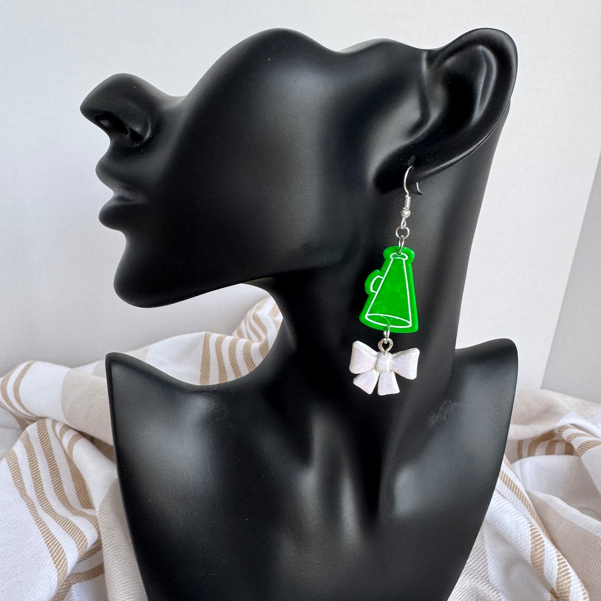 Show off your spirit in true cheer fashion with our Loud & Proud earrings! Handmade from lightweight polymer clay, each pair features a bold megaphone and matching cheer bow—both customizable in your team’s colors. Perfect for game nights, pep rallies, and every touchdown in between. Hypoallergenic hooks keep them comfy all night, so you can cheer on your team in style.